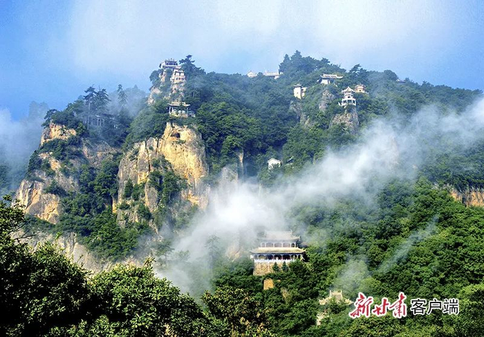 夏日雨后,崆峒山在阳光的映衬下,清透明亮。山顶云雾缭绕,云海滚滚而过。