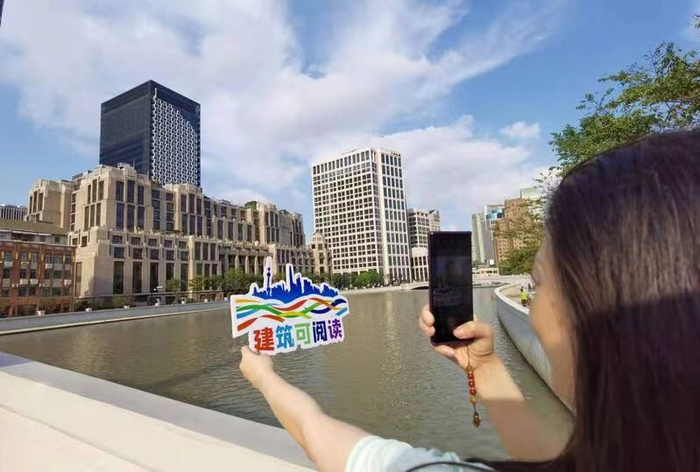 参加“建筑可阅读”主题线路的游客在苏州河畔打卡。资料图片