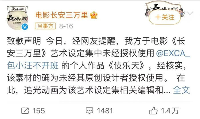 这两天,电影《长安三万里》因未获授权,使用他人素材公开道歉。