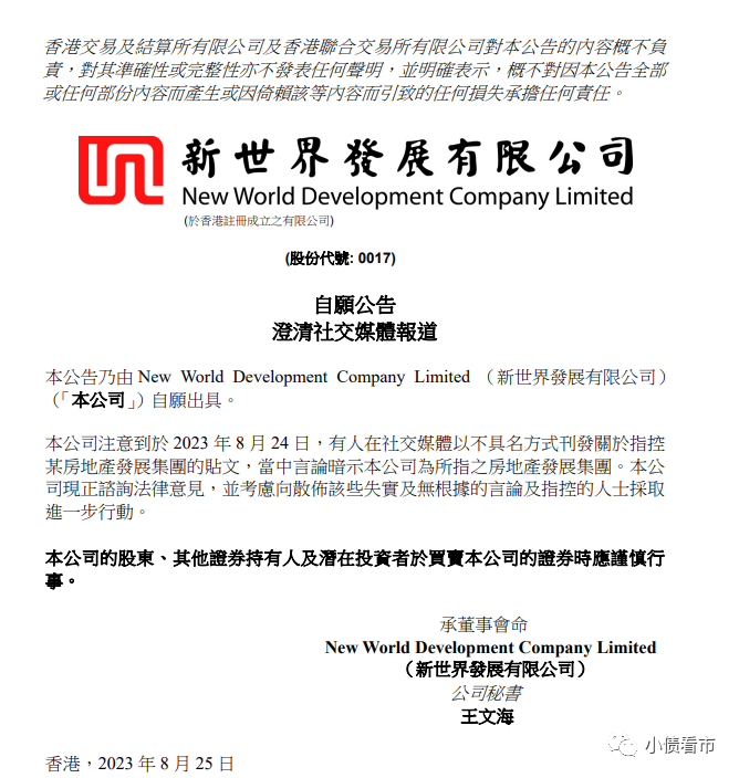 同时,新世界发展还发布公告,对上述消息予以澄清。