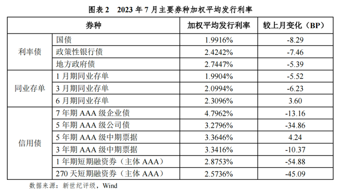 2023年7月,在市场资金需求偏弱,流动性较为充裕的情况下,债券市场各主要券种发行利率以下行为主。