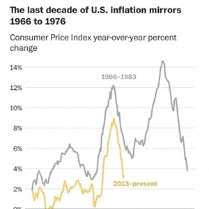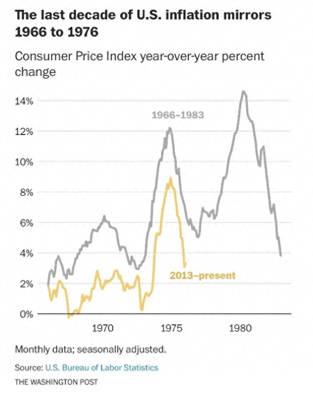 今年他重复此句恐怕还有另外一层意思。就在会议前,美国前财长萨默斯在《华盛顿邮报》的一篇专栏里贴出了下面这幅图,他指出不要轻易认为通胀威胁已经解除,过去10年的通胀走势与1966-1976年的通胀走势十分相似,而1976年后美国又经历一轮高通胀。鲍威尔的意思应该是:您多虑了。