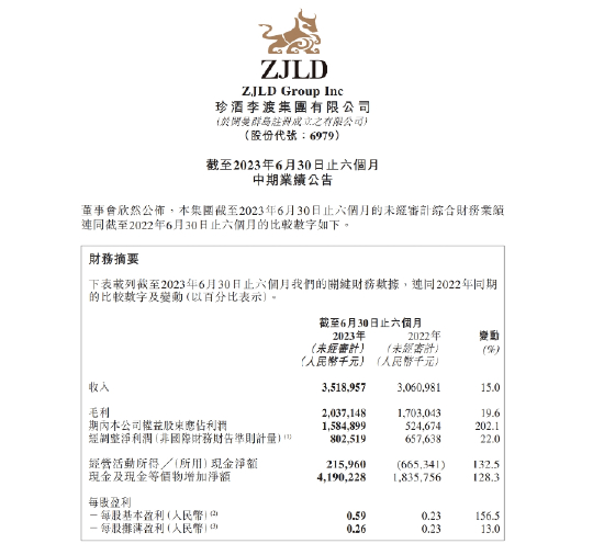 近日,“港股白酒第一股”珍酒李渡发布上半年财报,财报显示,2023年1-6月,珍酒李渡实现营业收入35.2亿元,同比增长15%,经调整净利润8亿元,同比增长22%,营收、净利润均取得两位数增长,业绩远超市场预期。