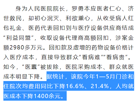 官方做过统计,这人被抓后,这家医院门诊和住院费用同比下降了16.6%和21.4%。