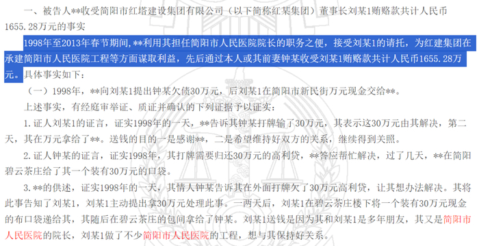 四川资阳市的陈院长,接受某集团的贿赂款共计人民币1655.28万元,协助其在承建简阳市人民医院工程等方面谋取利益。