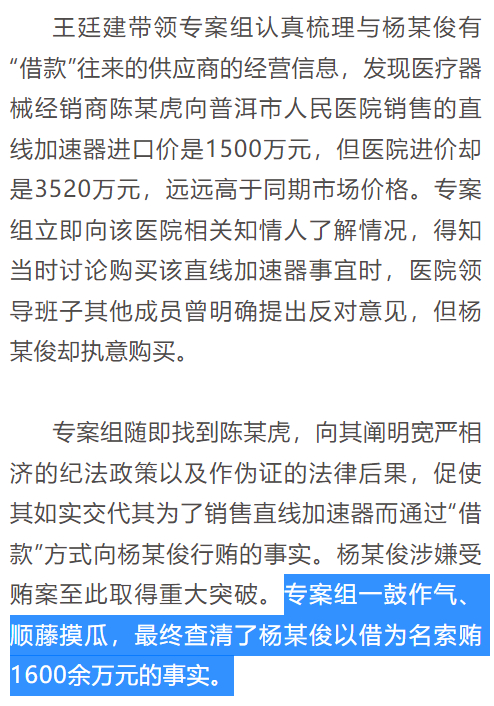 普洱市人民医院院长杨文俊,曾经执意以3520万元的价格购入一台名为“直线加速器”的医疗器械,而其真实进口价1500万元,不到一半。