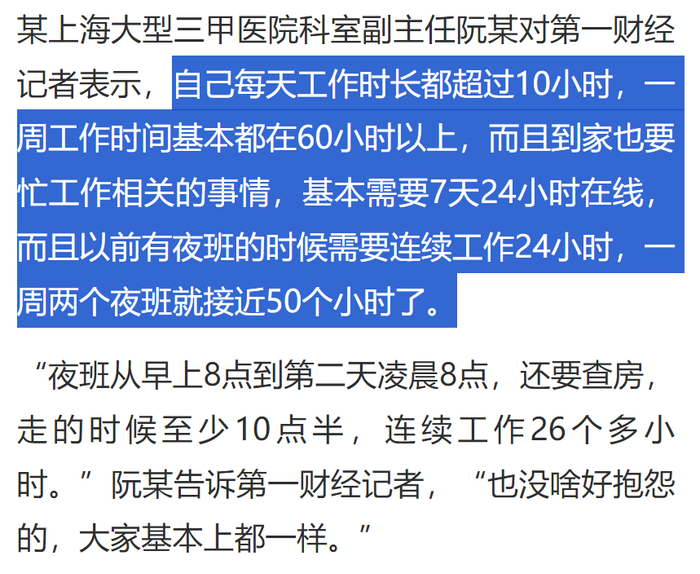 新闻报道也提到,很多科室的工作时长超过10小时,如果有夜班经常连续24小时以上。