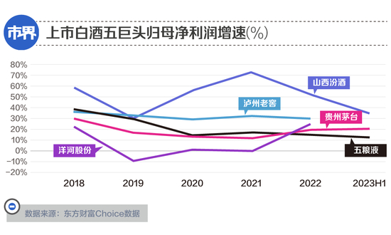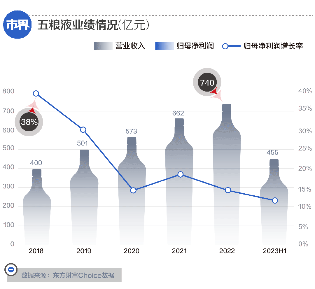 从图表可以看出,从2022年开始,五粮液就成了五巨头中增速最慢的一个。而如果拆分一下上半年,2023年第二季度,五粮液的营业收入与归母净利润均同比仅增长了5.1%左右,稀释了上半年整体的增长。