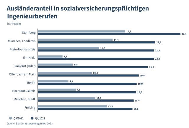 报告还研究了MINT技术人员的就业区域,发现有很大差别:2022年底,柏林工程师职业中的外国人比例为19%,而梅克伦堡-西波美拉尼亚州仅为不到4%。研究人员将图林根州的伊尔姆区、勃兰登堡州的奥得河畔法兰克福和柏林称为 “东部灯塔”,在那里工作的外国籍工程师尤其多。