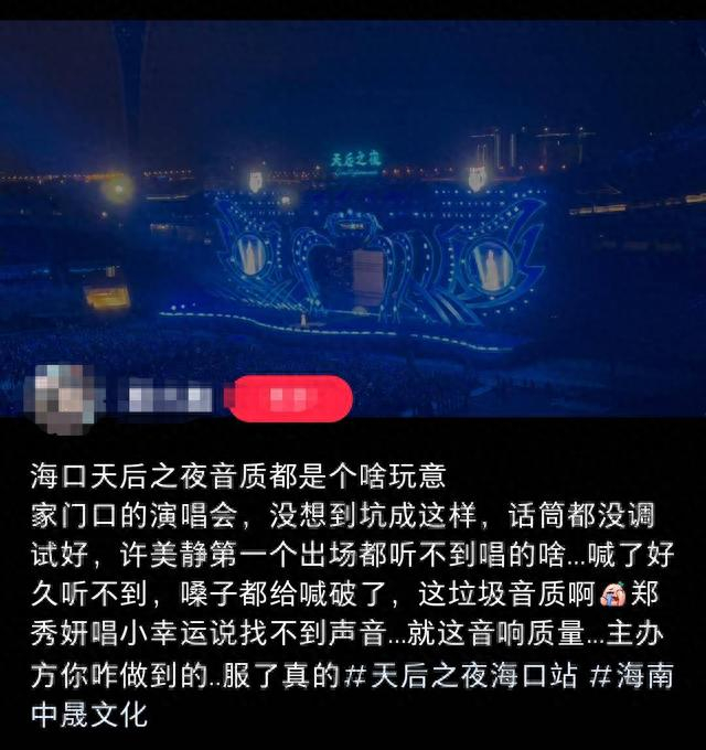 据多位观众发布的现场视频,当场演唱会刚开场前几位歌手的声音几乎一点儿也听不见,歌手的声音非常模糊,无法听清的观众们在现场大喊“听不见”,观众大喊的声音甚至都能盖过舞台上歌手的歌声。“天后之夜全场只能听到退票和听不到,真的没人来管管吗?”“没试过这种连讲话都听不清的演唱会,挺失望的。”“音响效果还不如KTV。”“内场都好几首歌听不清了。”