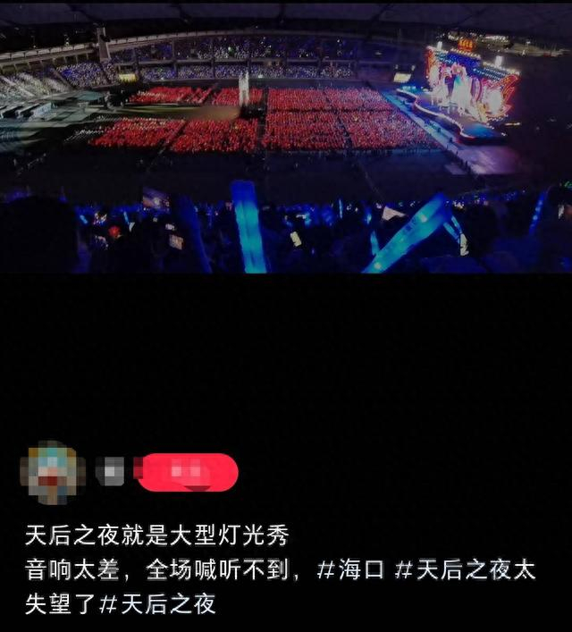 因为现场音效太差导致观演体验不佳,有多位观众在演出结束后在社交平台上呼吁大家去投诉退票,“朋友们一定要投诉退票,太敷衍看台的观众了。”“已经打12345投诉了,大家动起来呀!退票!” 8月28日,小红书网友分享了海口市旅游和文化广电体育局对天后之夜演唱会投诉的回复,回复中称对于该网友提出的演唱会声音小的问题向主办方海南中晟文体集团有限公司反映核实,其回复为“我们于演出期间收到信息反馈后,第一时间加大了该观演区域的声场,并派专人到达该区域实施现场监听,有效保障了后续观演效果。”