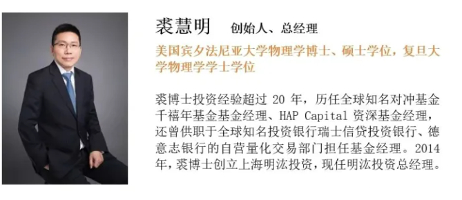 裘慧明为美国宾夕法尼亚大学物理学博士、硕士,复旦大学物理学学士,投资经验超过20年,历任全球知名对冲基金千禧年基金基金经理,HAP Capital资深基金经理,还曾供职于瑞士信贷投资银行、德意志银行的自营量化交易部门,担任基金经理。2014年裘慧明创办了上海明汯投资。