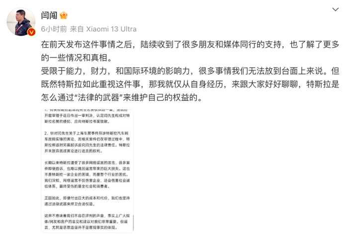 针对特斯拉的回应,今日,微博用户“闫闯”也再次发文称:“受限于能力,财力,和国际环境的影响力,很多事情我们无法放到台面上来说。但既然特斯拉如此重视这件事,那我就仅从自身经历,来跟大家好好聊聊,特斯拉是怎么通过“法律的武器”来维护自己的权益的。”