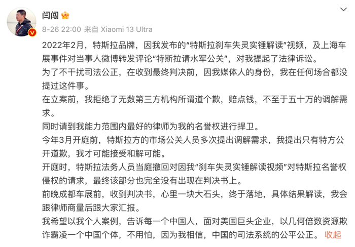 事情是这样的,8月26日,微博用户“闫闯”在微博发文称,2022年2月,特斯拉品牌因其发布的“特斯拉刹车失灵实锤解读”视频及上海车展事件对当事人微博转发评论“特斯拉请水军公关”,对其提起了法律诉讼。为了不干扰司法公正,在收到最终判决前,因其媒体人身份,其在任何场合都没提过这件事。在立案前,拒绝了无数第三方机构所谓道个歉,赔点钱,不至于五十万的调解需求。同时请到能力范围内最好的律师为其名誉权进行捍卫。