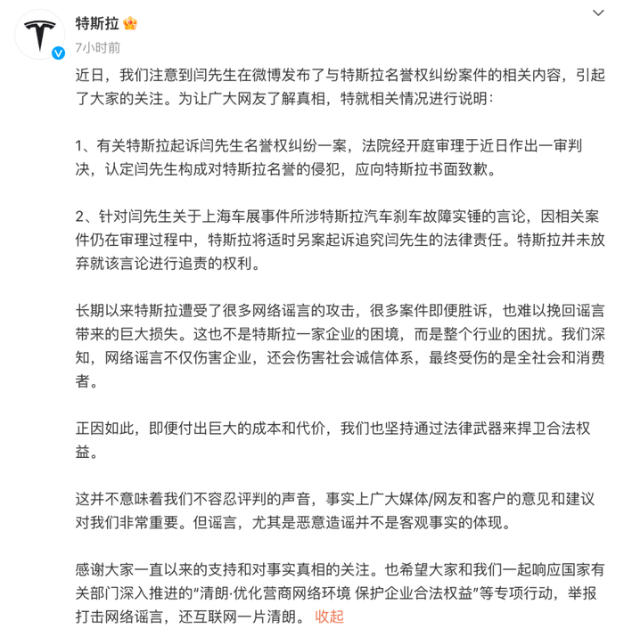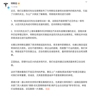 8月28日,特斯拉在微博发文回应与微博用户“闫闯”名誉权纠纷案。特斯拉称,近日,我们注意到闫先生在微博发布了与特斯拉名誉权纠纷案件的相关内容,引起了大家的关注。为让广大网友了解真相,特就相关情况进行说明:1、有关特斯拉起诉闫先生名誉权纠纷一案,法院经开庭审理于近日作出一审判决,认定闫先生构成对特斯拉名誉的侵犯,应向特斯拉书面致歉。2、针对闫先生关于上海车展事件所涉特斯拉汽车刹车故障实锤的言论,因相关案件仍在审理过程中,特斯拉将适时另案起诉追究闫先生的法律责任。特斯拉并未放弃就该言论进行追责的权利。