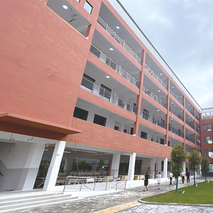 校园建筑风格整洁大气,校内整体设计采用现代风格,结合建筑U字形布局,形成内聚型庭院空间,通过重构的方式将艺术、自然和游戏融入学习环境,营造温暖安全及自然美好的成长环境。