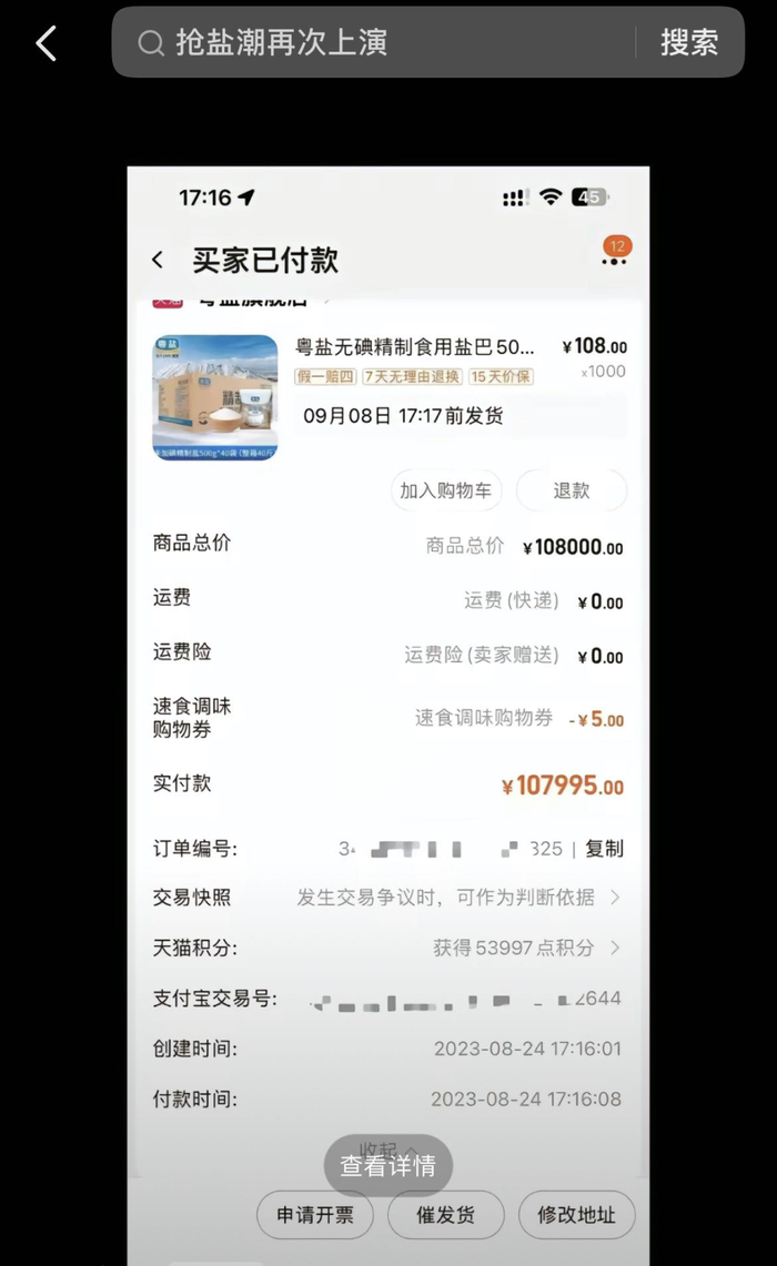 网络流传,有人下了十万多元的买盐大单。