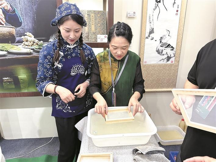 展馆内,江西省展位装饰精美,分设雕琢时光、茶香万里、文房雅器、服饰风华以及旅游风光五大展区,其中,前四个展区为非遗展示区。文房雅器展区专门设立了铅山连四纸制作技艺交流体验区。铅山连四纸制作技艺于2006年入选第一批国家级非物质文化遗产名录。铅山县级传承人申斯在展会现场准备了竹浆和纱网。