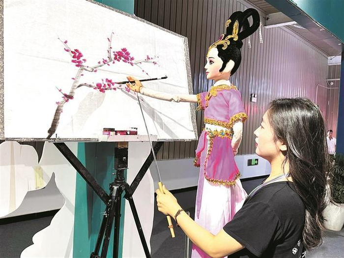 辽西木偶戏是中国古老的木偶艺术之一,是国家级非物质文化遗产项目,该项目的国家级传承人王娜有30多年的木偶戏演出经验。在现场,来自东北的观众樊毓彬在王娜的指导下表演木偶戏,木偶在樊毓彬的操作下,绘制了一幅生动的梅花图。