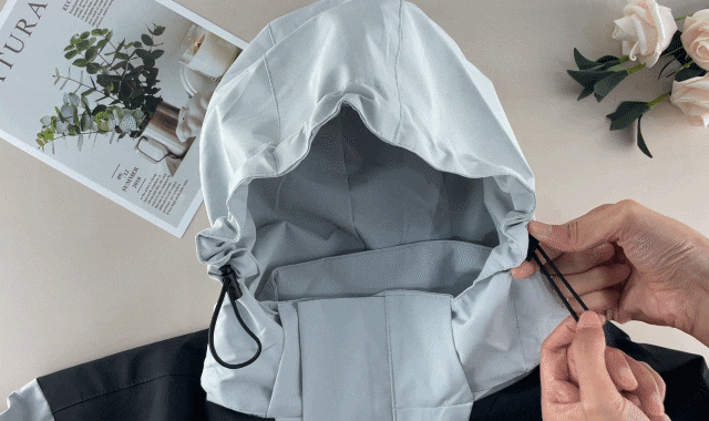 冲锋衣上的帽子做了抽绳设计,佩戴的时候可以自由调控头围大小。