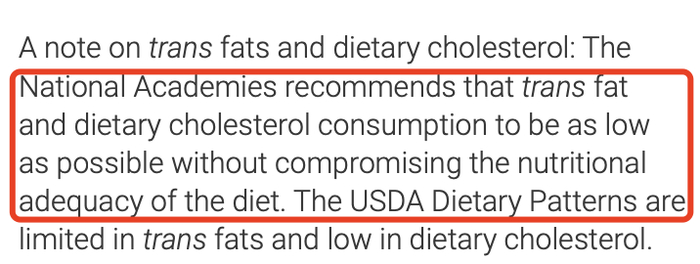 所以早在 2016 年美国就取消了健康个体每天 300mg 胆固醇的限制,[3]但这不等于美国认为富含胆固醇的食物可以随便吃。美国国家科学院明确建议:在不影响营养充足的情况下,要尽可能低摄入胆固醇,如图。