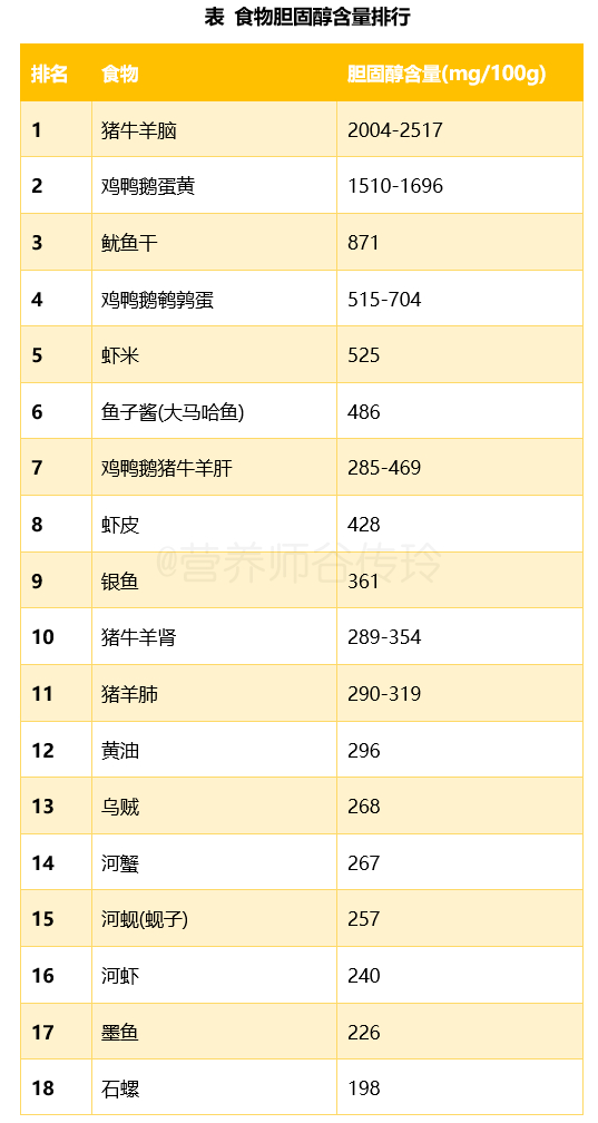 另外下表中的食物胆固醇含量都不低,可以偶尔吃,但最好算着胆固醇少量吃,别胆固醇摄入超标了。