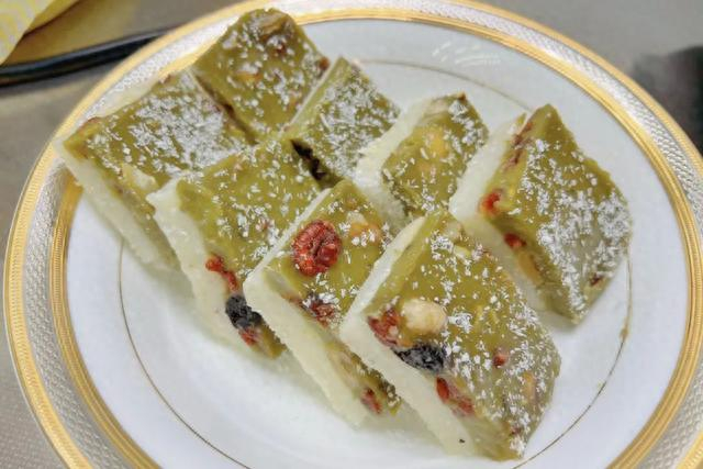 4.水开后上锅蒸15分钟,冷却后撕掉保鲜膜,撒椰蓉,切块。(冷却时间尽量长一点,方便切块不沾刀哦)