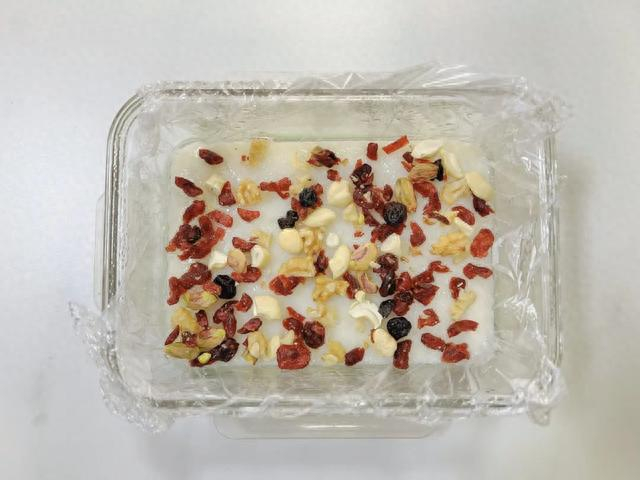 2.水开后上锅蒸10分钟,随后铺上一层蔓越莓、核桃等坚果。