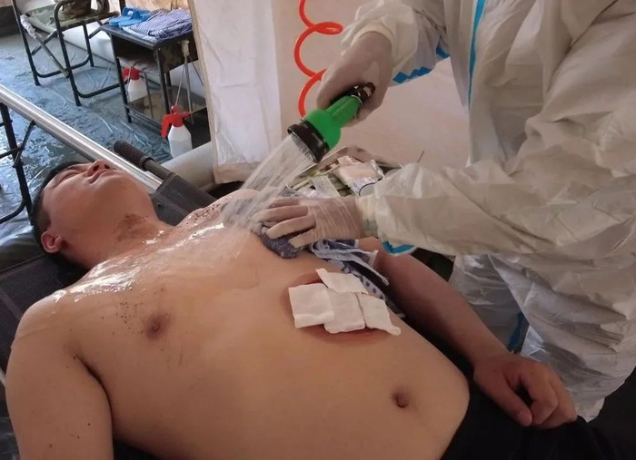 “核化生伤病员有别于普通伤病员,在处置步骤环节上均有特殊要求,不仅要进行急救,还要进行伤员转移、洗消。”医疗队员介绍到,为增加演练真实性、视觉冲击感,他们通过伤情贴、伤情化妆等手段模拟人体四肢和局部肌肉、皮肤被爆炸或染毒所致皮肤裂开、急性疱疹样改变等伤情,训练不同类型伤员伤情分类、科学洗消及效果评价。