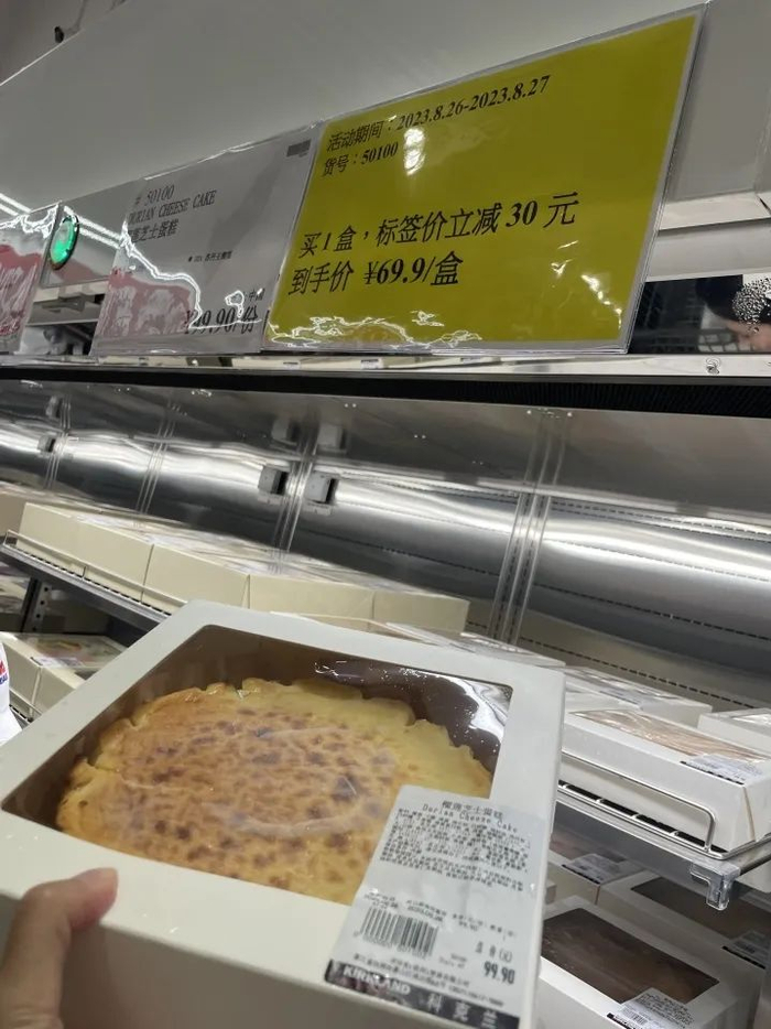 此外,前一段时间与山姆盒马大打价格战的榴莲芝士蛋糕也备受消费者欢迎。货架上的价格为99.9元/份,开业优惠69.9元。但当记者赶到时,已被消费者抢购一空。一旁的工作人员不停地补货上架。
