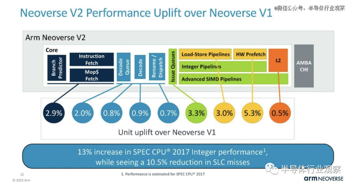 Arm 表示,与 V1 相比,这些 V2 变化综合起来使每个内核的性能提高了约 13%。如果添加的话,每个部分的数字并不等于 13% 的增长。这是因为某些变化会影响其他变化,因此总数小于每个单独改进领域的总和。