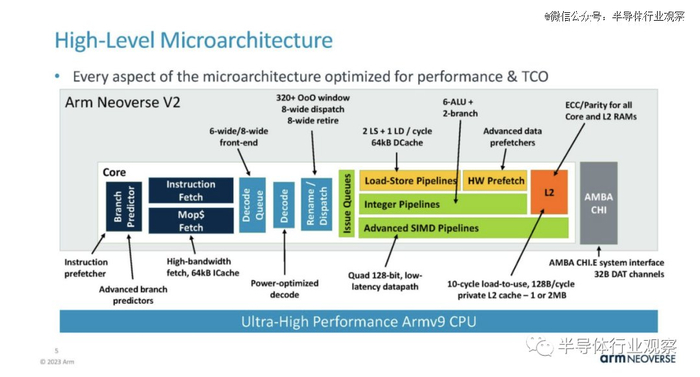 Arm Neoverse V2 是 Armv9 架构。这是一张显示核心部分亮点的图表。