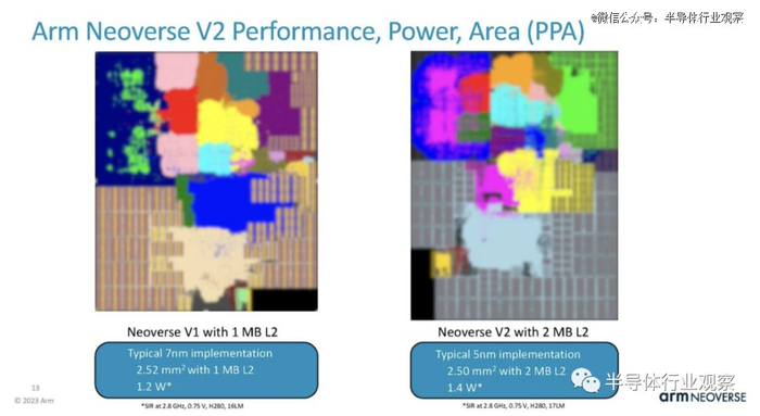 Arm 表示,新内核从台积电 7 纳米缩小到 5 纳米,尽管 L2 缓存增加了一倍,但功耗仅增加了约 17%,面积也大致相同。有趣的是,上面幻灯片中的 Arm 表示 V2 快了 13%,但下面的幻灯片使用了 16.666% 的功率。