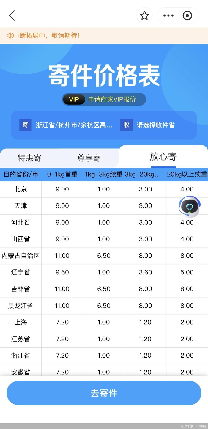 而菜鸟的“放心寄”起步价要比“尊享寄”略微便宜,例如菜鸟标快从杭州余杭区发往北京、上海1KG以内一件商品价格为9元、7.2元,顺丰为9.9元、8.9元。但菜鸟还未将超出一件寄件数量的情况纳入价格表中。