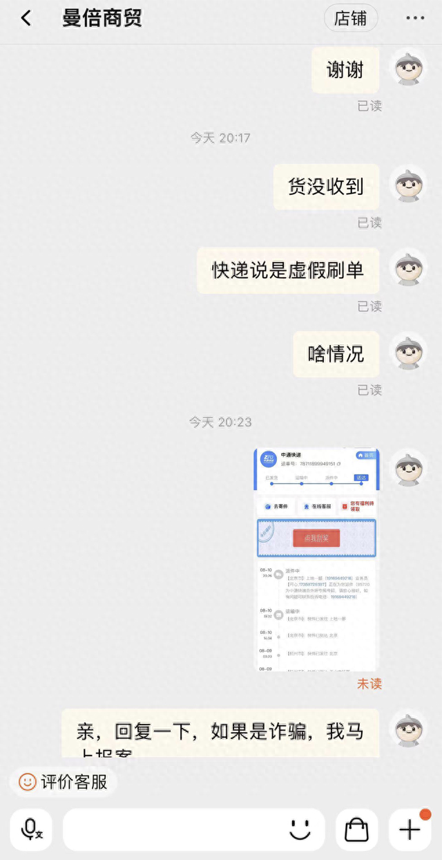 然而8月10日,李先生查询物流信息,显示该快递已经在派件中,但自己左等右等却没有等来任何快递,“我联系了快递员,他说这个订单属于虚假刷单,根本没有实际的快递,应该是被骗了。”李先生立刻联系了该店铺的客服,却发现自己所发信息均为“已读”,但对方没有任何回复。