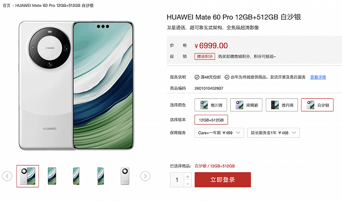 华为Mate60 Pro提前开卖:6999元起售,上架即售罄