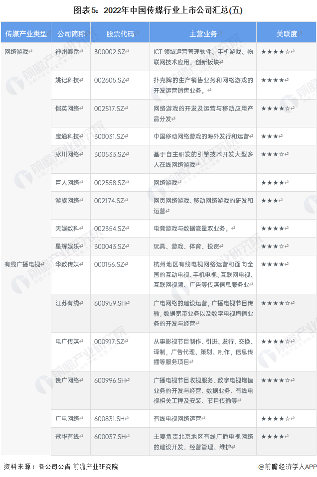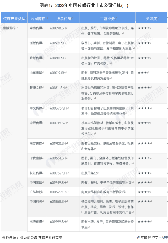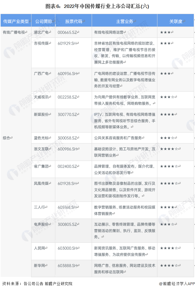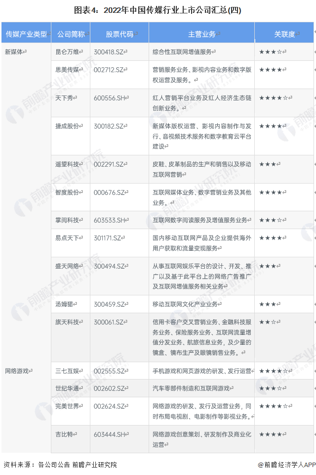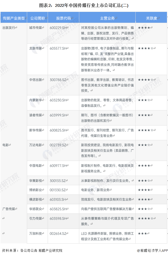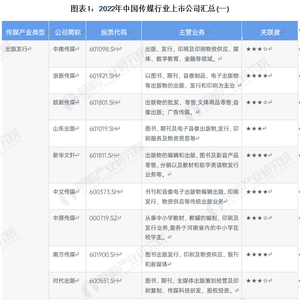 行业主要上市公司:蓝色光标(300058.SZ)、利欧股份(002131.SZ)、三七互娱(002555.SZ)、浙文互联(600986.SH)、省广集团(002400.SZ)、芒果超媒(300413.SZ)、凤凰传媒(601928.SH)、中南传媒(601098.SH)、浙版传媒(601921.SH)、皖新传媒(601801.SH)、世纪华通(002602.SZ)、山东出版(601019.SH)、新华文轩(601811.SH)、中文传媒(600373.SH)、万达电影(002739.SZ)、天龙集团(300063.SZ)、中原传媒(000719.SZ)、分众传媒(002027.SZ)、华数传媒(000156.SZ)、南方传媒(601900.SH)、长江传媒(600757.SH)、中国出版(601949.SH)等