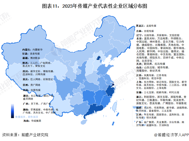 从代表性企业分布情况来看,我国传媒代表企业分布在北京、上海、浙江、广东等省市,总体来看企业主要集中于东南区域。
