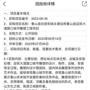 据中国政府采购网上的一份鲁山县住建局鲁山县迎宾大道路口城市雕塑工程项目中标公告显示,此次招标公告的发布日期是今年6月14日,采购方式为公开招标,7月6日开标,同日发布中标公告,中标金额为715.2万元,中标企业为睿泽艺术(深圳)有限公司。