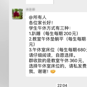 有网友发布一张学校老师收取午休费用的群聊截图。截图显示,每学期趴睡200元,躺平360元,床位680元,均是自愿原则。8月29日,该校工作人员表示,这是东莞市下发的一个文件,家长可自愿选择,老师会统一管理。