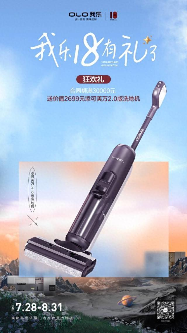 除了整家定制价格直降外,我乐家居18周年庆携手全国650家经销商,联动全国900+城市、2500家门店,为用户带来多重生日好礼:进店礼、小定礼、大定礼、联购礼、满赠礼??等等,其中最吸引人的莫过于嘉年华狂欢礼??。我乐家居18周年庆活动期间,用户合同额满30000元,送添可芙万2.0版洗地机(价值2699元)!