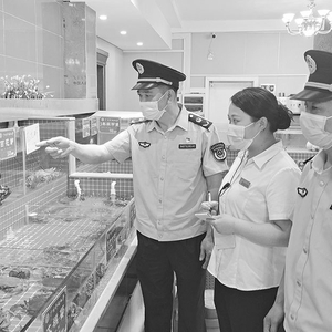 图为8月26日,该局执法人员在一餐饮店检查水产品。王雨林 摄