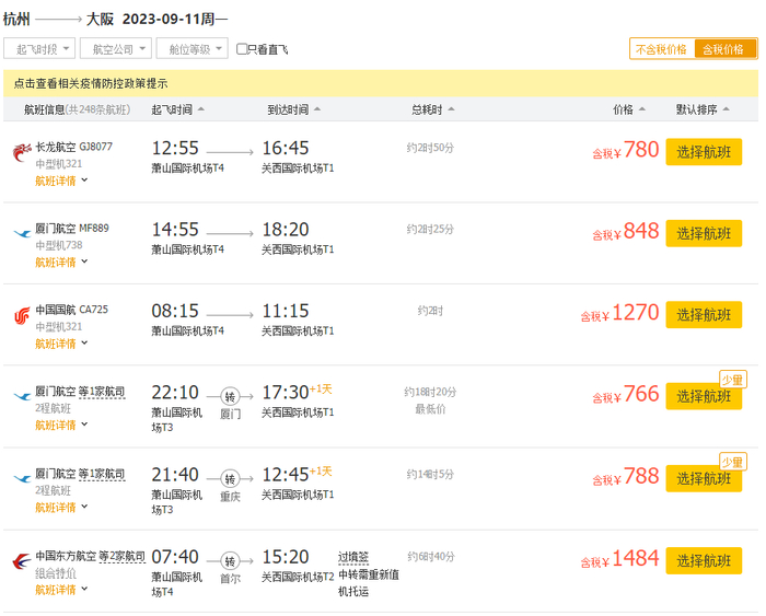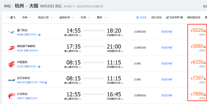 国庆假期,杭州飞大阪的机票价格在5000元至8000元之间。