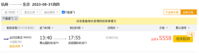 但是如今再次查询,发现不同日期,同时间段同航空公司,杭州到东京的机票价格只要5558元,直降7206元,相当于腰斩。