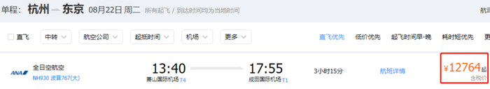 当时,记者查看了各大平台的机票价格,杭州到日本东京,8月22日的机票价格突破了12000元。