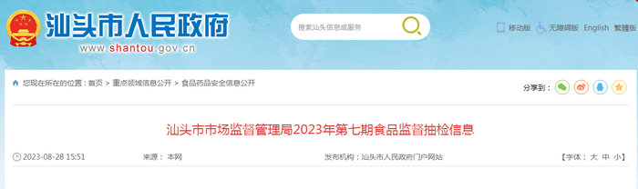 广东省汕头市市场监督管理局发布2023年第七期食品监督抽检信息