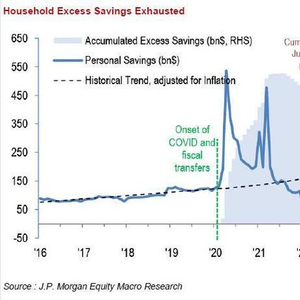 根据摩根大通的估算,截至今年6月份,美国消费者的累积超额储蓄已经由2.1万亿美元的高峰水平下降至-910亿美元。
