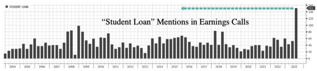 与此同时,分析师们注意到,今年秋季即将恢复的学生贷款偿还期或许也将成为美国消费的重大考验。统计数据显示,在第二季度财报电话会议中,提及“学生贷款”的次数飙升至创纪录的151次,千亿消费支出或许将面临冲击。