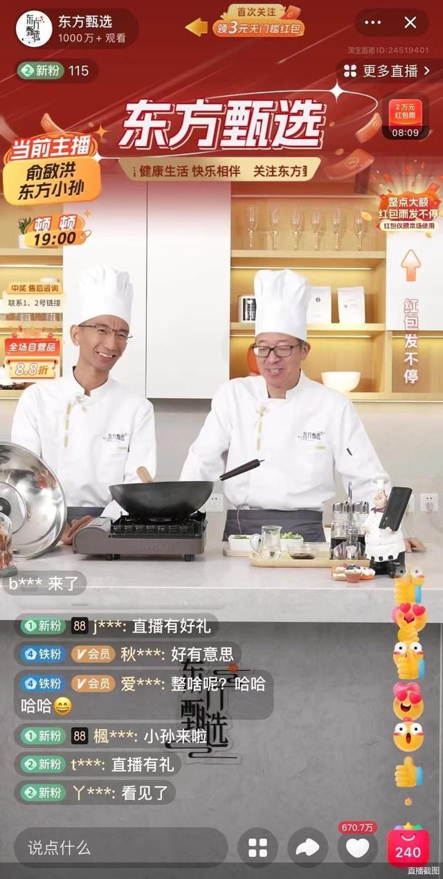 到了8月29日17:30,新东方创始人俞敏洪和东方甄选CEO孙东旭接班带货时,东方甄选淘宝账号粉丝数114.8万。两人为了配合带货,打扮成厨师的模样边带货边做饭。