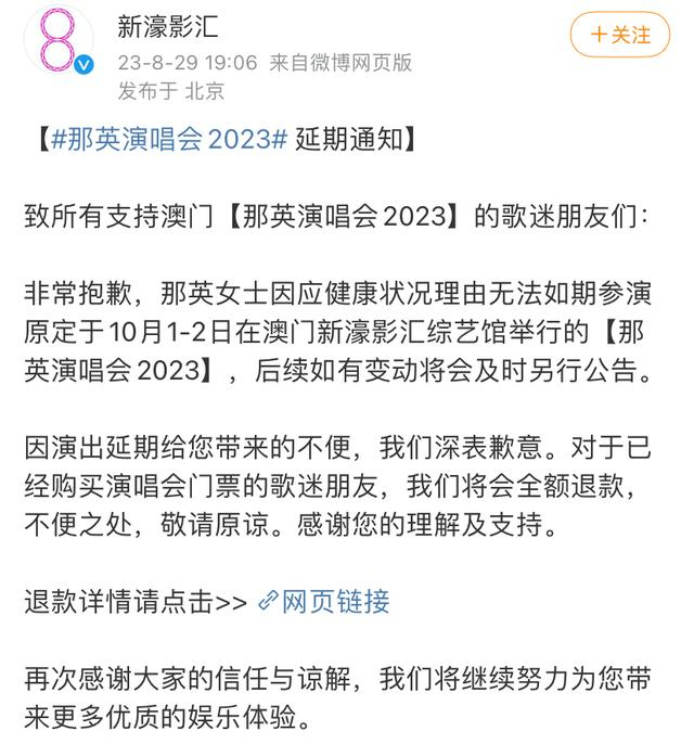今(29)日,新濠影汇官微发文:非常抱歉,那英女士因应健康状况理由无法如期参演原定于10月1-2日在澳门新濠影汇综艺馆举行的“那英演唱会2023”,后续如有变动将会及时另行公告。